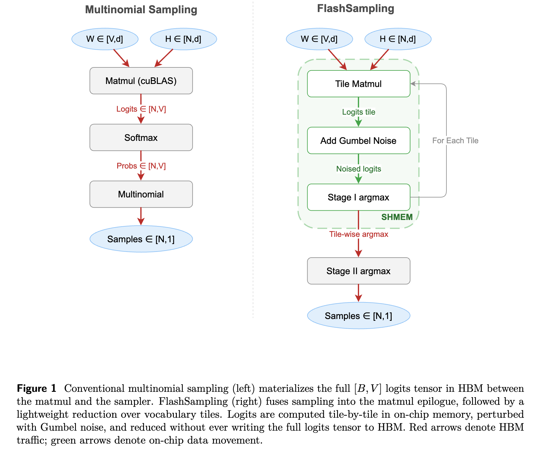 We present FlashSampling, an exact sampling primitive that fuses sampling into the LM-head matmul and never materializes the logits tensor in HBM. The method is simple: compute logits tile-by-tile on chip, add Gumbel noise, keep only one maximizer per row and per vocabulary tile, and finish with a small reduction over tiles. FlashSampling enables efficient categorical sampling by fusing the operation into the language model head matmul, eliminating memory overhead and reducing decoding time by up to 19%.